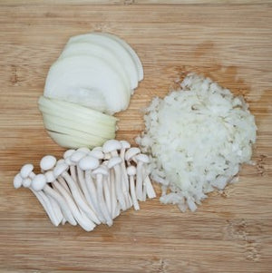 【A】玉ねぎをみじん切りにする。【B】玉ねぎを薄切りにする。