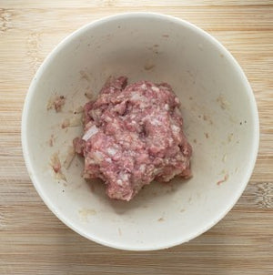 ボウルに牛ひき肉、豚ひき肉、塩(小さじ1/2弱)(4人前 小さじ1弱)を入れて、粘り気がでるまで手でよくこねる。